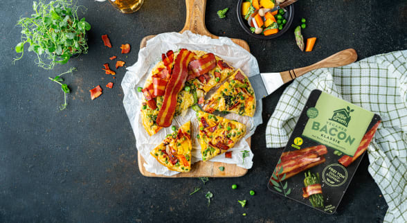 Crispy, fresh & einfach lecker: Der perfekte Mix aus buntem Gemüse, cremigem Pfannkuchenteig und Billie Green Veganem Bacon. Gönn dir diesen veganen Allrounder – ob zum Brunch, Lunch oder Dinner: einfach mixen, braten und genießen! Billie Green Veganer Bacon auf Basis von Weizenprotein überzeugt durch seinen fleischigen, würzigen und rauchigen Geschmack.