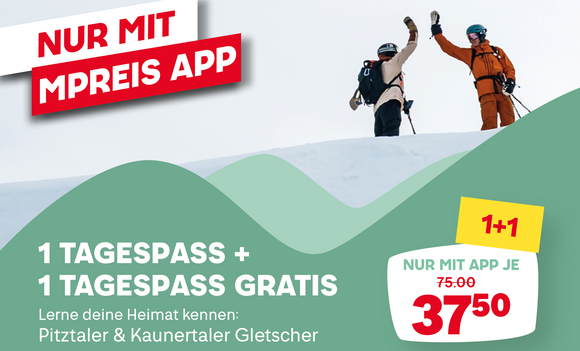 Mit der MPREIS App gibt's 2 Tagesskipässe für den Pitztaler & Kaunertaler Gletscher zum Preis von einem.